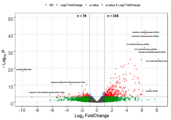 The sequencing reads from 7 dpe were mapped to 32,959 genes in the rainbow trout genome, and 417 differentially expressed genes (DEGs) were identified in infected fish relative to their time-matched controls, including 338 (81%) upregulated genes and 78 (19%) downregulated genes (Figure 6 and Supplementary S1). Among the DEGs, 30 genes were strongly upregulated (Log2-FC > 4), including C-C motif chemokine 4-like (285.6 fold), two paralogs of C-C motif chemokine 13-like (46.7, 79.9 fold), three copies of C-C motif chemokine 19-like (27.8, 42.7, 51.4 fold), two paralogs of caspase-14-like (34.7, 139.2 fold), five paralogs of interferon-induced protein 44-like (20.6, 42.8, 68.7, 82.8, 86.4, 161.2 fold), interferon-gamma 2 precursor (32.4 fold), and cathelicidin 1 precursor (38.1 fold). Five genes were found to be strongly downregulated: protein CREG1-like (−969.7 fold), troponin T-fast skeletal muscle isoforms (−78.5 fold), cytochrome P450 2K4 (−38.4 fold), C-X-C motif chemokine 13-like (−29.2 fold), CUGBP Elav-like family member 3-B (−23.8 fold), and guanylyl cyclase-activating protein 2-like (−19.6 fold).