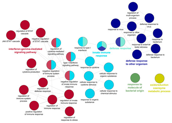 GO enrichment analysis was conducted on the 338 upregulated genes to gain insight into the biological functions of these DEGs, as well as the involved molecular processes. This identified 115 significantly enriched GO terms among the upregulated genes. ClueGo analysis clustered these terms into networks revolving around GO terms for “defense response to other organism”, “defense response”, “innate immune response”, and “interferon gamma-mediated signaling pathway” (Figure 7). No specific GO enrichment was found among the 78 downregulated genes.