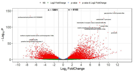 The sequencing reads from 21 dpe mapped to 34,286 genes and 11,984 DEGs were identified in infected fish relative to their time-matched controls. Of these, 5801 (48%) were upregulated and 6183 (52%) were downregulated. In addition to the increased number of DEGs at 21 dpe, the magnitude of the differential expression also greatly increased, with 1,149 DEGs being strongly upregulated (Log2-FC > 4) (Figure 8 and Supplementary S1).
