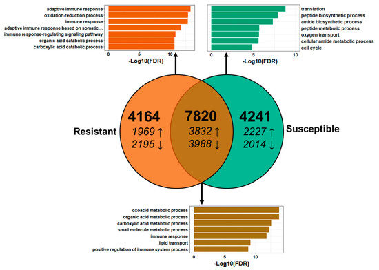 Comparison of the differential gene expression between resistant and susceptible steelhead trout at 21 days post exposure to Ceratonova shasta. Venn diagram showing the number of differentially expressed genes (DEGs) shared between resistant and susceptible steelhead trout. Arrows indicate upregulation vs. downregulation. The top seven most statistically significant enriched GO terms for each set of DEGs are shown in the corresponding bar graphs.