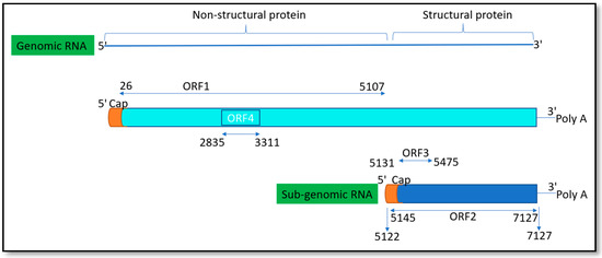 The hepatitis E virus (HEV) is a positive-sense single-stranded RNA virus, ~7.2 kb in length. It is a member of the genus hepevirus of the family Hepeviridae [1]. Computer-based genome annotation initially revealed three overlapping open reading frames (ORFs), ORF1, ORF2, and ORF3; some gt1 strains additionally contain an ORF4 [2,3,4]. ORF1 encodes for nonstructural proteins and is the largest ORF with 5079 bases. ORF2 and ORF3 are translated from a sub genomic RNA and encode for structural proteins consisting of 1980 and ~342 nucleotides (Figure 1). Computer-assisted alignment of the domains in ORF1 demonstrated that there are distinct functional domains: (a) methyl transferase (MT), (b) Y domain, (c) papain-like cysteine protease (PCP), (d) proline-rich hinge domain, (e) X domain, (f) RNA helicase, and (g) RNA-dependent RNA polymerase (RdRp) [3]. Furthermore, many of their functional activities have been biochemically demonstrated [4].