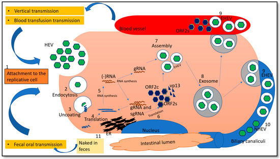 Transmission and life cycle of HEV. HEV binds cellular receptors which are still incompletely characterized. Entry is mediated by endocytosis. Uncoating is followed by the release of viral genomic RNA which serves as mRNA for ORF1 translation. RdRp synthesizes negative strand RNA (- RNA), followed by synthesis of genomic RNA (gRNA) and sub-genomic RNA (sgRNA). Translation of structural proteins occurs followed by assembly and egress. The released HEV is enveloped (EHEV), however when released into biliary canaliculi, envelope becomes degraded, and naked (NHEV) virions are released into intestines and excreted in feces. The EHEV is also released into the blood vessels. Furthermore, ORF2s (secreted form) is glycosylated and secreted into the blood stream. When such blood is transfused to naive patients or if the woman is pregnant, HEV transmission happens, which is referred as blood-borne transfusion or vertical transmission, respectively. Number 1 to 11 represents the step-by-step process occurring in the life cycle. ER—Endoplasmic reticulum.
