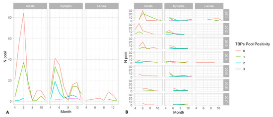 Number of pools negative (0) or positive for 1, 2, or 3 TBPs per tick stage collected monthly during 2011–2017 (A) and per year (B). Axes x (Month): 4 = April, 6 = June, 8 = August, 10 = October.