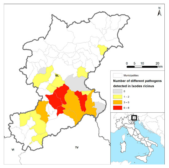 For years, a high tick abundance, TBP circulation, and TBD cases have been reported in the Veneto region; in particular, the Belluno province is historically considered an endemic area for TBPs [43,44,45], and it will be classified as a risk area soon [46,47,48].