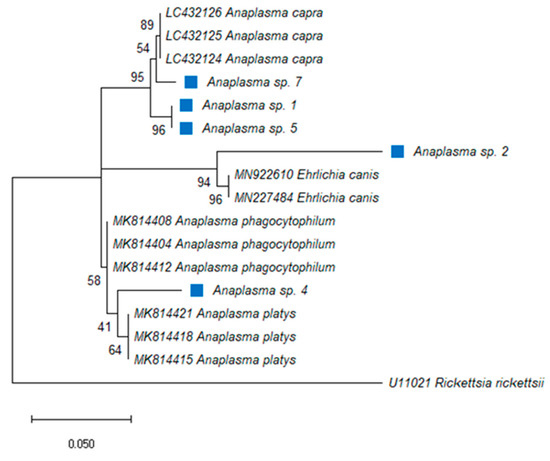 Phylogenetic analysis by Maximum Likelihood (ML) inferred from the 16S rRNA gene, method based on the Kimura 2-parameter model with gamma distributions (+G). The tree highlights the position of Anaplasma and Ehrlichia spp. The blue square indicates Anaplasma spp. identified in this study. Support values (bootstrap replicates of 1000) are indicated at each node of the branch.