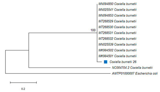 The amplified PCR product of approximately 687 bp was obtained from C. burnetii-positive ticks. The PCR amplicons from the IS1111 transposase gene were generated from two ticks and sequenced, and DNA sequence analysis revealed that the sequence from R. decoloratus in Butha-Buthe and the other from R. e. evertsi in Mohale’s Hoek were identical. A C. burnetii sequence was identified from two tick species in this study and was submitted to GenBank and assigned as C. burnetii 26 (MT592821). The 493 nucleotide sequences of the IS1111 transposase gene from 11 bacterial species or isolates belonging to gammaproteobacterial were used to assess the phylogenetic relationships. A member of this class Raoultella ornithinolytica was used as an outgroup species. The phylogenetic analysis showed that C. burnetii from this study (designated C. burnetii 26) was closely related to C. burnetii (MT268531) isolated from a tick in Algeria and C. burnetii 26 formed a monophyletic group with other C. burnetii strains, with 100% identity (Figure 2).