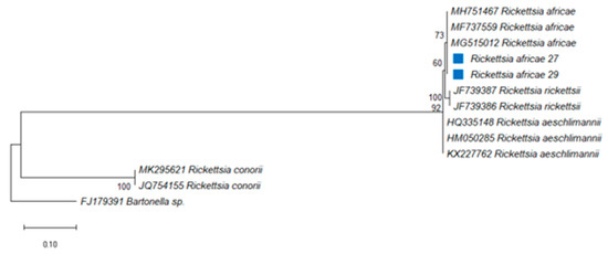 - Halajian, A.; Palomar, A.M.; Portillo, A.; Heyne, H.; Luus-Powell, W.J.; Oteo, J.A. Investigation of Rickettsia, Coxiella burnetii and Bartonella in ticks from animals in South Africa. Ticks Tick Borne Dis. 2016, 7, 361–366. [Google Scholar] [CrossRef]