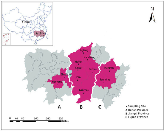 From 2015 to 2019, a total of 1254 fresh fecal samples from pigs with diarrhea were collected from Jiangxi Province (n = 1036), Hunan Province (n = 83), and Fujian Province (n = 135) (Table 1 and Figure 3). Only pigs with dilute feces or watery diarrhea were sampled, and all samples were collected by anal swab. Among these fecal samples, 307 fecal samples were from suckling piglets (<21 days), 299 fecal samples were from weaned piglets (21–70 days), 95 fecal samples were from fattening pigs (71–180 days), and 553 fecal samples were from sows (>180 days) (Table 1). All fecal samples were placed in a cryopreservation box with an adequate amount of ice bags immediately after sampling, and then were stored in a refrigerator at −80 ℃ before DNA extraction.