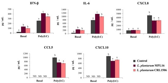 Influence of L. plantarum strains on the antiviral immune response of respiratory epithelial cells induced by Toll-like receptor 3 (TLR3) signaling activation. Calu-3 cells were treated with L. plantarum MPL16 or CRL1506 (5 × 107 cells/mL) for 24 h and then stimulated with poly(I:C) for 48 h. Respiratory epithelial cells with no lactobacilli treatment were used as controls. Before (basal groups) and after (poly(I:C) groups) TLR3 activation, the culture supernatants were collected for cytokines´ determination using ELISA. ND: not detected. The results represent data from 3 independent experiments. Letters indicate significant differences (p < 0.05), a < b < c.