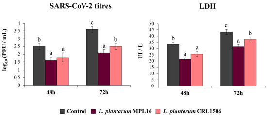 Influence of L. plantarum strains on the resistance of respiratory epithelial cells to infection with severe acute respiratory syndrome virus 2 (SARS-CoV-2). Calu-3 2B4 cells were treated with L. plantarum MPL16 or CRL1506 (5 × 107 cells/mL) for 24 h and then infected with the coronavirus. Respiratory epithelial cells with no lactobacilli treatment were used as controls. SARS-CoV-2 titers and LDH levels in culture supernatants were evaluated at hours 48 and 72 post-infection. The results represent data from 3 independent experiments. Letters indicate significant differences (p < 0.05), a < b < c.