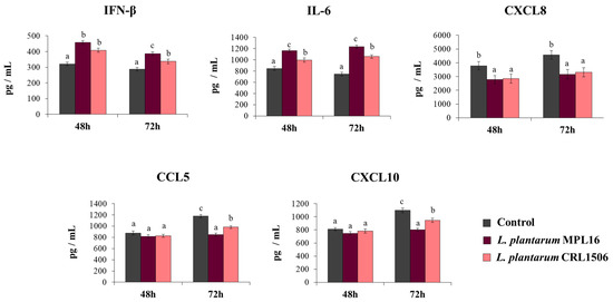 Influence of L. plantarum strains on the antiviral immune response of respiratory epithelial cells induced by the infection with severe acute respiratory syndrome virus 2 (SARS-CoV-2). Calu-3 2B4 cells were treated with L. plantarum MPL16 or CRL1506 (5 × 107 cells/mL) for 24 h and then infected with the coronavirus. Respiratory epithelial cells with no lactobacilli treatment were used as controls. Culture supernatants were collected for cytokines´ determination using ELISA at hours 48 and 72 post-infection. The results represent data from 3 independent experiments. Letters indicate significant differences (p < 0.05), a < b < c.
