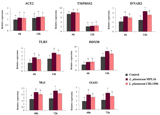 We also evaluated the expression of the receptors used by SARS-CoV-2 to invade respiratory epithelial cells at hours 6 and 12 post-infection, since it has been suggested that the coronavirus can modulate their expression earlier after the challenge of Calu-3 cells [34]. While the expression levels of ACE2 were similar in the two time points assessed, the expression of TMPRSS2 was significantly higher at hour 6 than hour 12 (Figure 4). No differences were found when ACE2 and TMPRSS2 expression in lactobacilli-treated cells were compared with controls. Increased expression of the PRRs TLR3 and DDX58, as well as the receptor IFNAR2 were found in Calu-3 cells infected with SARS-CoV-2, and the up-regulation was more notable at hour 12 than hour 6 (Figure 4). Both L. plantarum MPL16 and CRL1506 were able to significantly enhance the expression of TLR3, DDX58 and IFNAR2 when compared to control cells at the two-time points studied. However, the MPL16 strain was more efficient than L. plantarum CRL1506 in increasing DDX58 and IFNAR2 at hour 12 post-infection (Figure 4). In addition, Calu-3 cells increased their expression of Mx1 and OAS1 at hours 48 and 72 post-infection. MPL16 and CRL1506 treatments were able to significantly augment the expression of both antiviral factors when compared to control cells at the two time points assessed. However, L. plantarum MPL16 was more efficient than the CRL1506 strain in increasing Mx1 and OAS1 at hour 72 post-SARS-CoV-2 infection (Figure 4).