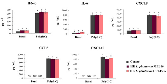 Influence of non-viable L. plantarum strains on the antiviral immune response of respiratory epithelial cells induced by Toll-like receptor 3 (TLR3) activation. Calu-3 cells were treated with heat-killed (HK) L. plantarum MPL16 or CRL1506 (5 × 107 cells/mL) for 24 h and then stimulated with poly(I:C) for 48 h. Respiratory epithelial cells with no lactobacilli treatment were used as controls. Before (basal groups) and after (poly(I:C) groups) TLR3 activation, culture supernatants were collected for cytokines´ determination using ELISA. ND: not detected. The results represent data from 3 independent experiments. Similar letters indicate no significant differences (p < 0.05).