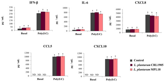The effect of probiotic lactobacilli on the mucosal immune responses has been shown to be a strain-specific property. In fact, the immunomodulatory abilities of one Lactobacillus strain cannot be extrapolated to others, even of the same species [24,37]. Thus, we aimed to evaluate the effect of non-immunomodulatory L. plantarum strains on respiratory epithelial cells in the context of TLR3 activation. For this purpose, we stimulated respiratory epithelial cells with the non-immunomodulatory strains CRL1905 and MPL18 [23,24,38] and then challenged them with poly(I:C). As shown in Figure 7, L. plantarum CRL1905 and MPL18 were not able to modify the levels of IFN-β, IL-6, CXCL8, CCL5 or CXCL10 in the supernatants of Calu-3 cells before the challenge with poly(I:C). The CRL1905 and MPL18 strains were also unable to induce modifications in the concentrations of IFN-β, IL-6 and chemokines after the activation of TLR3 (Figure 7).