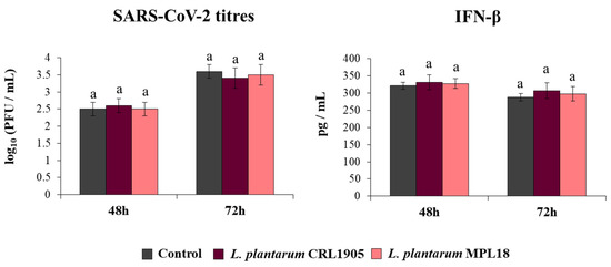 Influence of non-immunomodulatory L. plantarum strains on the resistance of respiratory epithelial cells to the infection with severe acute respiratory syndrome virus 2 (SARS-CoV-2). Calu-3 2B4 cells were treated with L. plantarum CRL1905 or MPL18 (5 × 107 cells/mL) for 24 h and then infected with the coronavirus. Respiratory epithelial cells with no lactobacilli treatment were used as controls. SARS-CoV-2 titers and interferon (IFN)-β levels in culture supernatants were determined at hours 48 and 72 post-infection. The results represent data from 3 independent experiments. Similar letters indicate no significant differences (p < 0.05).