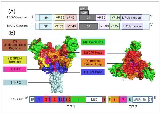 (A) A comparison of the EBOV and MARV genome structures highlighting key differences such as how EBOV has multiple GP gene products and where there are differences in overlapping genes. (B) A diagram of the EBOV GP with domains highlighted based on the work of Lee et al. 2009 []. Domains of the EBOV GP as they appear on the gene: GP1, SP (signal peptide), GP1 base residues: (33–69, 95–104, 158–167 and 175–189), GP1 Head: (70–94, 105–157, 168–175 and 214–226), Glycan Cap: (227–310), MLD Mucin-like-Domain, and in GP2, N-terminus of GP2, Internal Fusion Loop: (511–553), HR1 (554–598), HR2 (599–630), MPER Membrane proximal external region, TM transmembrane domain, CT Cytoplasmic tail. Regions highlighted in brown are uncharacterised as they could not be assigned to a domain due to differences with the protein structure used and the domains as listed by Lee et al. 2009 (32, 191–195, 210–211, 470–478) and the protein structure used from Zhao et al. [,]. Regions of the EBOV GP in white boxes with blue outlines are regions that could not be shown via X-ray diffraction and so do not appear on the GP structure in the diagram, in addition to residues (28–30, 196–209, 284–285, 294–300, 431–469, 632–669) [,]. Diagram was created with BioRender.com (©BioRender 2021, accessed in June 2021) and the protein structure was generated in The PyMOL Molecular Graphics System, Version 2.0 Schrödinger, Delano Scientific LLC, Berkeley, CA, USA using the PDB accession: 5JQ3.