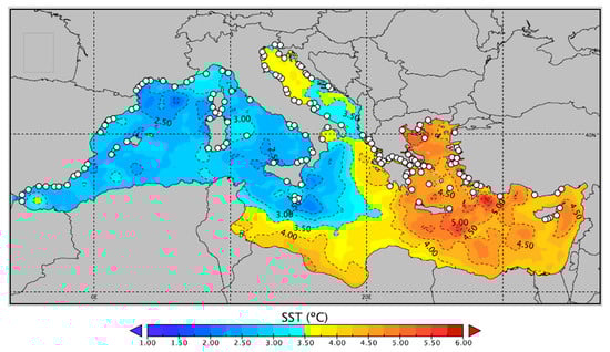 Projection of the average sea surface temperature difference between the year 2015 and 2100 in the Mediterranean Sea. White dots represent the distribution of main known European fish farms. Reproduced with permission from Sakalli 2017 [37]. Fish farm locations were included using data from Med-IAMER (2014) [39].