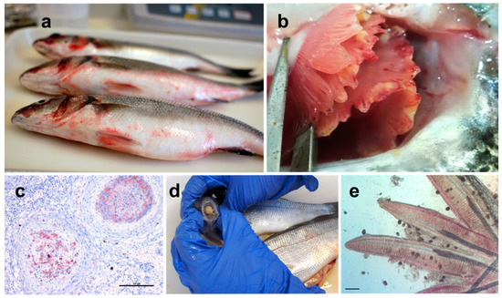 Vibrio harveyi has been reported as responsible for tail rot disease, causing mass mortalities in larvae and juveniles in farmed gilthead seabream in Malta [276]. It has been found on reared European seabass (Figure 3a) and gilthead seabream in different farms along the Spanish Mediterranean coast [277]. Specifically, different strains of the bacteria have been isolated from the internal organs or ulcers of diseased and healthy gilthead seabream and European seabass, with the latter showing higher overall occurrence. All isolated strains tested for virulence have been demonstrated to be pathogenic in European seabass, while gilthead seabream was apparently unaffected, except for a single strain inducing 10% mortalities. Although the temperature in the study was not specified, authors underlined that the prevalence in both fish species was related to season, occurring only in the warm months between June and November. The difference in susceptibility between European seabass and gilthead seabream has also been confirmed in cases where V. harveyi was isolated from the ascitic fluid of gilthead seabream juveniles presenting abdominal swelling [278]. An intraperitoneal injection of the isolated strain in both European seabass and gilthead seabream resulted in lower mortality for the latter. Even though co-habitation trials did not show a horizontal transfer of the pathogen between carriers and healthy fish, asymptomatic gilthead seabream was suggested as a reservoir, representing a threat in areas where both fish species are farmed simultaneously.