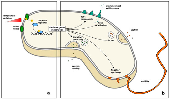 Increase of virulence in bacteria in response to temperature variation: (a) change of temperature causes autophosphorylation of a sensor kinase, which in turn activates a cytoplasmatic transcription activator leading to the transcription of virulence genes; (b) the release of a quorum sensing signal, biofilm formation, Type III secretion system assembly, synthesis of flagellar components and related flagellar motility have been related to temperature variation in different species of bacteria.