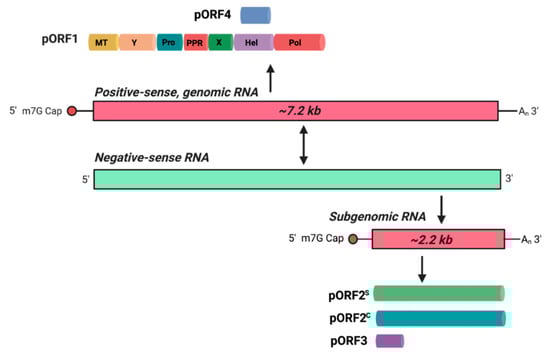 HEV genome, replication, and translation. Hepatitis E virus (HEV) has an ~7.2kb, positive-sense (+) single-stranded genomic RNA, which contains ORF1, ORF2 and ORF3 as described below, plus ORF4, an additional ORF unique to HEV genotype 1 that translates pORF4 promoting virus infection upon endoplasmic reticulum (ER) stress stimulation. Genomic RNA has a 7-methylguanosine (m7G) Cap at the 5’ end and is polyadenylated at the 3’ end. After viral entry and uncoating, the positive-sense full-length viral genome is translated by host ribosomes to produce a polyprotein pORF1 that contains Met, Hel, RdRp, ‘Y’, ‘X’, ‘HVR’, and putative PCP domains. pORF1 transcribes a negative-sense (−) intermediate RNA from the positive-sense strand. The negative-sense strand then serves as a template for the transcription of numerous positive-sense RNA genomes for packaging into new progeny virions, as well as an ~2.2 kb subgenomic RNA (sgRNA) containing ORF2 and ORF3, while ORF3 entirely overlaps with ORF2 except for one leading base pair. The sgRNA is also capped at the 5ʹ end and polyadenylated at the 3ʹ end, and translates into the capsid protein (pORF2C), secreted antigen (pORF2S), and protein ORF3 (pORF3) via a leaky scanning mechanism.