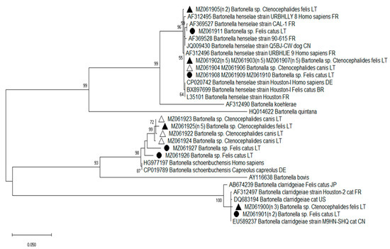Unexpectedly in this study, Bartonella genotypes closely related genetically to B. schoenbuchensis were detected in cats and in both flea species. These Bartonella genotypes have not yet been documented as infecting cats in Europe. Bartonella schoenbuchensis strains are associated with ruminants and usually transmitted by deer keds (Lipoptena spp.) [39,40,41,42]. In Lithuania, strains closely related to B. schoenbuchensis have been detected in deer keds Lipoptena cervi and Lipoptena fortisetosa (GenBank: MT873590–MT873595) [43]. Wild and domestic ruminants have also been found to harbor Bartonella capreoli, Bartonella chomelii, Bartonella melophagi and Bartonella bovis [40,44,45]. Bartonella schoenbuchensis, B. capreoli and B. chomelii (which have been isolated from roe deer, red deer and cattle) are genetically and biologically close species and are members of the same Bartonella clade [46]. Bartonella bovis (formerly Bartonella weissii) is commonly detected in cattle [44,47,48,49] and can cause endocarditis in infected animals [50]. However, this species was originally isolated from four domestic cats from Utah and Illinois (USA) and, together with B. henselae, B. clarridgeiae, and B. koehlerae, was reported as the fourth Bartonella species found to infect cats in North America [1,51]. Breitschwerdt et al. suggested that the detection of B. weissii in both cats and cattle may reflect an unusual evolutionary adaptation for this particular Bartonella species [47].