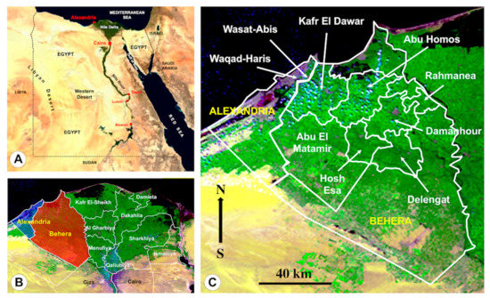Maps showing endemic areas studied: (A) General map of Egypt showing the northern Lower Egypt including the large Nile Delta and the southern Upper Egypt including the localities of Qena and Luxor; (B) map showing the governorates of the Nile Delta, including the western governorates of Alexandria and Behera; (C) map of the governorates of Alexandria and Behera, including the districts where human samples were collected. Background for A from composed satellite map of Africa orthographic projection by NASA (full resolution of 1624 × 1824 pixels; public domain) via Wikimedia Commons. Backgrounds for B and C from Probe-V satellite by European Space Agency (ESA: https://www.esa.int/ESA_Multimedia/Keywords/Location/Egypt/(sortBy)/view_count/(result_type)/images), high resolution 944.58 kB image accessed on 30 June 2021. Original S. Mas-Coma.