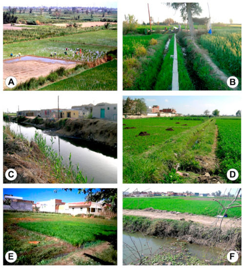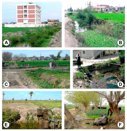 Fascioliasis transmission foci inhabited by lymnaeid snail vectors in the Behera governorate: (A) Rice fields observed from the fourth floor of school of children in El Kazza, Hosh Esa district; (B) irrigation canals filled by water pump in El Kazza, Hosh Esa district; (C) large secondary canal besides human dwellings in El Kazza, Hosh Esa district; (D) small canal for irrigation of cultivated field in the way for livestock manure fertilisation besides village in Zuhra, Kafr El Dawar district; (E) small canals for rice field irrigation close to human dwellings in Bolin El Aaly, Kafr El Dawar district; (F) wider canal with water hyacinth with village in the background in Tiba, Delengate district. (A,E): Photographs by S. Mas-Coma; (B–D,F): Photographs by P. Artigas.