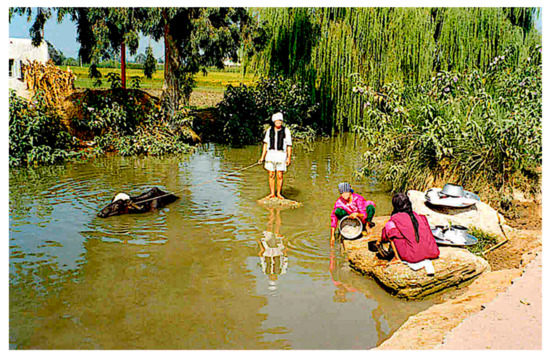 An appropriate study of the relationships between human infection by Fasciola and the dietary habits and household characteristics of Egyptian inhabitants in the Nile Delta showed that the daily consumption of raw seeds, followed by the presence of piped water in the house, the presence of livestock in the household, the habit to bring the animals to the canal for drinking and/or bathing (Figure 7), as well as the custom of cultivating the vegetables eaten in the household were important risk factors [53]. Entering into water canals to wash foods, dishes, clothes, vegetables and even themselves, as well as drinking water from the smaller irrigation canals bordering the plantations surrounding the outer village suburbs, are additional risky activities. Accumulation of infecting flukes because of the absence of premunition may subsequently give rise to higher infection burdens in given subjects [20,22].