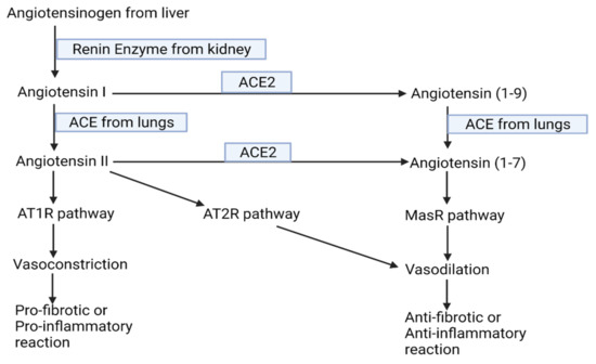Flowchart of RAS. ACE, Angiotensin converting enzyme; AT1R, Angiotensin type 1 receptor; AT2R, type 2 receptor; MasR, Mas receptor. The boxes wrap the relevant enzymes catalyzing the reaction (created with BioRendor.com. Accessed on 9 September 2021).