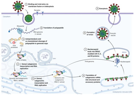 Major events in the life cycle of coronaviruses. Nsps, non-structural proteins; DMV, double membrane vesicles; ERGIC, endoplasmic reticulum-golgi intermediate compartment (created with BioRender.com. Accessed on 28 July 2021).