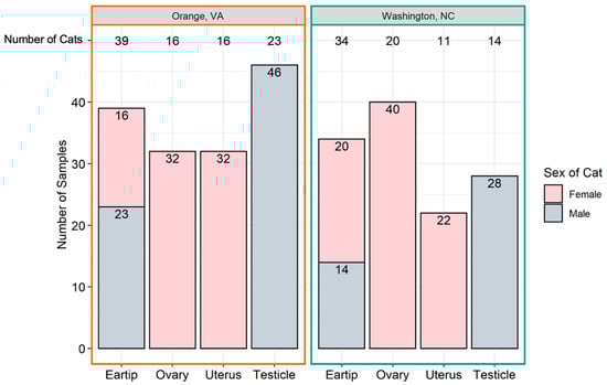 Ear tip and reproductive tissues were obtained from 73 cats, including 36 females (49%) and 37 males (51%). The number and type of samples obtained from each location is provided in Figure 1. Thirty-nine cats were from Orange, VA (54%) and 34 were from Washington, NC (46%). The proportion of female and male cats from Orange, VA and Washington, NC were not significantly different (p = 0.16). The mean weight of all cats was 3.13 kg; Orange, VA cats had a mean weight of 3.21 kg (standard deviation 1.13 kg), whereas Washington, NC cats had a mean weight of 3.04 kg (standard deviation 0.9 kg); there was no significant difference in weight by location (p = 0.44). Male cats (mean 3.46 kg, standard deviation 1.22 kg) were heavier than female cats (mean 2.73 kg, standard deviation 0.55 kg; p < 0.0001). Females had a mean number of 4.5 tissues tested (range 3–5), while all males had three tissues tested.