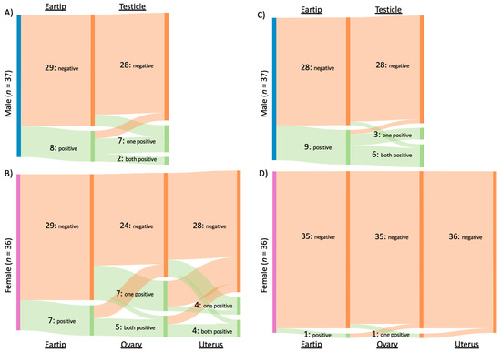 Number and type of tissue from which Bartonella spp. and Hemotropic Mycoplasma spp. were amplified. Type of tissue samples from which Bartonella spp. (A,B) or hemotropic Mycoplasma spp. (C,D) DNA was amplified from male (A,C) and female (B,D) cats. Each column represents a tissue (indicated at top or bottom) with the number cats of negative, one of two tissues positive, or both tissues positive indicated by the labelled bar. x.