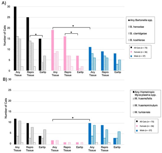 Number of cats infected with Bartonella spp. and hemotropic Mycoplasma spp. by tissue type. (A) Total number of cats positive for any Bartonella spp., B. henselae, B. clarridgeiae, and B. koehlerae on either ear tip or reproductive tissues by sex. (B) Total number of cats positive for any hemotropic Mycoplasma spp., Mhf, Mhm, and Mtc on either ear tip or reproductive tissues by sex. * Statistical significance considered at p < 0.05 by Fisher’s exact test.