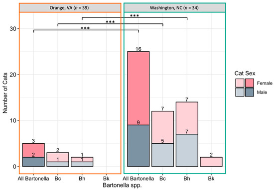 Number of cats infected with Bartonella spp. by location. Cats were considered positive if one or more tissue samples were qPCR positive for all Bartonella spp., B. clarridgeiae (Bc), B. henselae (Bh), or B. koehlerae (Bk). *** Statistical significance considered at p < 0.0001 by Fisher’s exact test.
