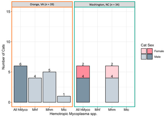 hMyco DNA was more likely to be amplified from male cats (10/37, 27%) than female cats (2/36, 6%; p = 0.02; Figure 3B). The proportion of cats with hMyco-positive qPCR was similar at both geographic locations, with 15% (6/39) of cats from Orange, VA hMyco PCR positive and 18% (6/34) of cats from Washington, NC (p = 1) hMyco PCR positive. The number of cats positive for hMyco by location and sex is summarized in Figure 5. Cat weight was significantly associated with hMyco infection: the mean weight of hMyco-positive cats was 4.31 kg compared to a mean weight of 2.90 kg for negative cats (p < 0.01). When only considering male cats, hMyco-qPCR-positive males (mean 4.71 kg) were heavier than the hMyco-negative males (mean 3.10 kg; p < 0.001). The two female cats were 2.65 kg and 2.05 kg, below the mean female cat weight of 2.72 kg (range 1.52–4.28 kg).