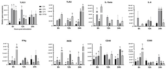 To evaluate C. perfringens bacilli-induced responses in macrophages, the expression of TLR21, TLR2, IL-1β, IL-6, interferon (IFN)γ, inducible nitric oxide synthase (iNOS), CD40, and CD80 genes was quantified at 6, 12, and 24 h post-stimulation. As shown in Figure 1, there was an upregulation (p < 0.05) of TLR21 gene expression in all the C. perfringens strains-treated groups at 6 h post-stimulation, while CP5 treatment showed a sustained elevation (p < 0.05) of TLR21 expression in these cells up to 12 h when compared to unstimulated controls. The transcriptional upregulation of TLR2 was found to be significant (p < 0.05) in CP26-treated macrophages at both 12 and 24 h, whereas the expression of this gene in macrophages stimulated with CP5 and CP1 strains was increased (p < 0.05) at 12 and 24 h post-stimulation, respectively, only when compared to controls. Treatment of macrophages with strain CP26 also induced an increased (p < 0.05) expression of IL-1β, IFNγ, iNOS, CD40, and CD80 genes at 6 h post-stimulation, compared to controls; additionally, the expression of IL-1β at 6 h and iNOS at 24 h was also higher (p < 0.05) in comparison to CP5-treated cells. Furthermore, while CP1 treatment induced upregulation (p < 0.05) of iNOS at 12 h (compared to the control) and CD40 at 24 h (compared to CP5 and the control), the CP5 strain induced increased (p < 0.05) iNOS (compared to CP1 and control) and CD80 (compared to control and CP26) transcription at 24 h post-stimulation.