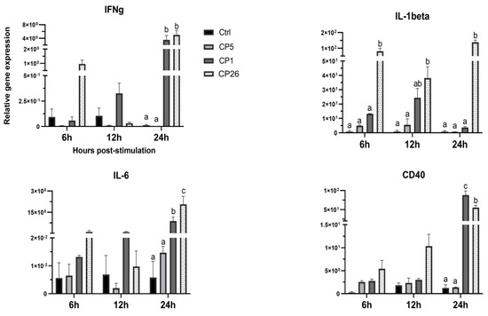 The stimulatory effects of C. perfringens secretory products on macrophages were evaluated based on the cellular expression of immune-related genes that included IL-1β, IL-6, IFNγ, TLR21, TLR2, iNOS, CD40, and CD80 at 6, 12, and 24 h post-stimulation. Three supernatant dilutions (1:2, 1:5, and 1:10) were used to stimulate macrophages, of which, 1:5 was found to be optimal based on the cell death and stimulatory potential. Figure 2 depicts the experiments that used 1:5 dilution of the C. perfringens secretory components. Macrophages treated with CP1 and CP26 secretory products had a higher (p < 0.05) expression of IL-6, IFNγ, and CD40 genes compared to CP5 and unstimulated control groups at 24 h post-stimulation (Figure 2). While strain CP26-induced IL-6 gene expression in macrophages was also higher (p < 0.05) than that of CP1-treated cells, the CD40 transcriptional upregulation in CP1-treated cells was higher (p < 0.05) compared to the CP26-treated group at 24 h post-stimulation. Additionally, the CP26 secretory products-induced transcription of IL-1β was higher (p < 0.05) than CP5 and controls at 6, 12, and 24 h and that of CP1 at 6 and 24 h post-stimulation (Figure 2). No significant differences in the expression of other above-mentioned genes were observed (data not shown).