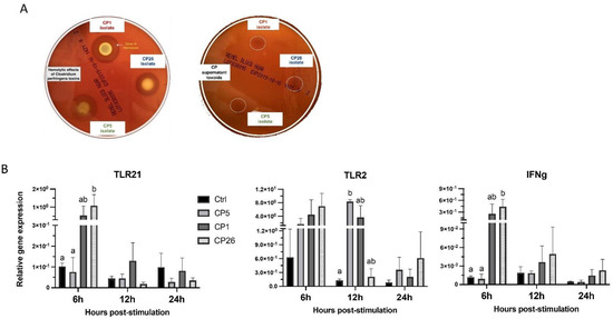 To determine if the neutralization activity in the supernatant component could induce a different cellular response phenotype, the macrophages were treated with supernatant toxoids (Figure 3a). The immune gene expression analysis showed that CP26 secretory toxoid could induce an upregulation (p < 0.05) of TLR21 and IFNγ transcription compared to CP5 and control-treated cells at 6 h post-stimulation (Figure 3b). Furthermore, the CP5 secretory toxoid-treated macrophages were found to have higher (p < 0.05) expression of TLR2 gene at 12 h post-stimulation when compared to unstimulated controls (Figure 3B). No significant differences in the expression of other immune-related genes were observed (data not shown).
