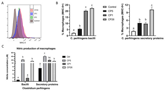 In vitro induction of macrophage activation by C. perfringens bacilli or their secretory products was evaluated as measured by their surface upregulation of MHC-II antigen presenting molecules as well as their production of NO. As depicted in Figure 4B, all C. perfringens strains, both whole cell and their secretory products, induced an upregulation (p < 0.05) in the surface expression of MHC-II molecule when compared to the unstimulated control. Furthermore, while the CP26 and CP1 bacilli-induced MHC-II expression was higher (p < 0.05) than CP5, the CP26 secretory products-induced MHC-II upregulation was higher (p < 0.05) when compared to that of CP5 and CP1 secretory products.