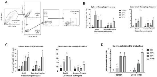 To evaluate primary macrophage cellular responses to C. perfringens and their secretory products, the spleens and cecal tonsils from broiler chickens were harvested and processed to obtain mononuclear single-cell suspensions of splenocytes and cecal tonsillocytes and used in the cell culture experiments. The gating strategy used in immunophenotyping analysis is shown in Figure 5a. The responses were measured by the enumeration of total macrophages (KUL01+ cells) and activated macrophages (KUL01+MHC-II+ cells) as frequencies within the mononuclear cell populations of spleen and cecal tonsils in response to C. perfringens stimulation. As depicted in Figure 5b, all C. perfringens strains (whole cells) induced an increase (p < 0.05) in the splenic macrophage frequency when compared to an unstimulated control. However, these numbers in CP5-treated groups were higher (p < 0.05) than the CP1- and CP26-treated cells. The stimulation of cecal tonsillocytes with CP1 and CP26 cells also led to an increase (p < 0.05) in the macrophage frequency when compared to an unstimulated control. The macrophage numbers in CP26-treated groups were also higher (p < 0.05) than the CP5- and CP1-treated cells. Furthermore, an increase in the splenic macrophage frequency in the group receiving CP26 secretory products was higher (p < 0.05) than the control, whereas the cecal tonsil macrophage frequency in this group was also higher (p < 0.05) when compared to the control, CP5, and CP1 groups (Figure 5B).