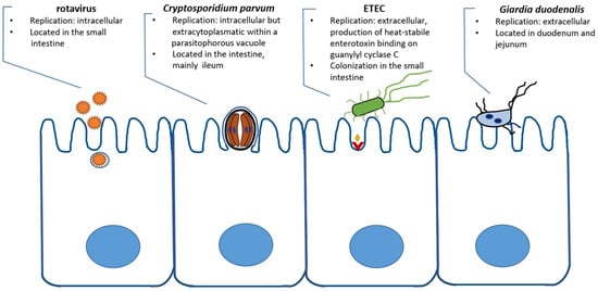 ETEC is able to produce either heat-labile (LT) or heat-stable (ST) enterotoxin and possesses several colonization factors for adherence to the intestinal epithelium []. F4, F5, F6, F17 and F41 are fimbrial adhesins responsible for adherence, while F5 (K99) and F41 have been reported to be highly related to the presence of diarrhoea in calves []. In beef and dairy calves, ETEC has been identified as the major cause of neonatal diarrhoea during their first 4 days of life, whereas diarrhoea is rare in older calves and adult animals []. Nevertheless, in some studies that examined the concurrent occurrence of several pathogens in young diarrhoeic ruminants, only small numbers of E. coli (K99) in terms of single or coinfection with C. parvum were detected [,,,,,]. An explanation for this could be the short period of time in which E. coli is shed or the use of vaccination, resulting in a low prevalence, although its incidence might be relatively high []. However, other authors discovered a higher prevalence of ETEC and coinfection with Cryptosporidium spp. ranging from 12% to 27.8% [,,,]. Tzipori et al. (1981) examined the coinfection of C. parvum and ETEC in experimentally infected lambs. Although ETEC was found in the feces of these animals, no mucosal colonization by the organisms was detected in any part of the intestine and bacterial infection did not aggravate the clinical response to Cryptosporidium []. Since experimental studies considering coinfection with E. coli and Cryptosporidium related to the clinical outcome of the disease are rare, the relevance of E. coli during the exposure of calves to cryptosporidia is difficult to assess. Nevertheless, the synergistic effects of coinfection were shown for concurrent infection with E. coli and rotavirus in experimentally infected calves [,,,,]; this may also apply to E. coli and particularly ETEC in mixed infection with cryptosporidiosis under certain conditions. However, sufficient data to prove this assumption are lacking.