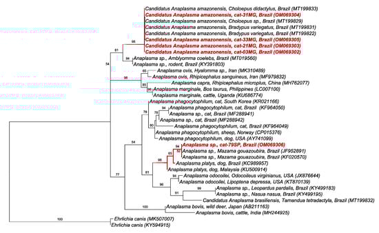 Phylogenetic tree based on an alignment of 246 bp of Anaplasma sp. rrs gene, using maximum likelihood method and TPM2 + I + G as an evolutionary model. Sequences from the present study were highlighted in red. Ehrlichia canis was used as an outgroup.