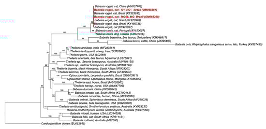 The phylogenetic analysis by ML and TIM3 + I + G evolutionary model (605 bp alignment) based on the 18S rRNA gene of piroplasmids positioned the sequences detected in one cat from Minas Gerais and one cat from Rondônia into the Babesia vogeli clade previously detected in dogs and cats from Brazil and China, with 69% branch support. Unfortunately, the sequence detected in one cat from São Paulo state presented low quality and was removed from the analysis (Figure 2).