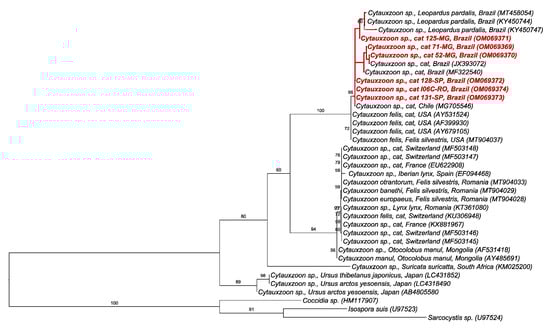 Phylogenetic tree based on an alignment of 118 bp of Cytauxzoon sp. 18S rRNA gene, using maximum likelihood method and TPM3 + G as an evolutionary model. Sequences from the present study were highlighted in red. Coccidia sp., Isospora suis, and Sarcocystis sp. were used as an outgroup.