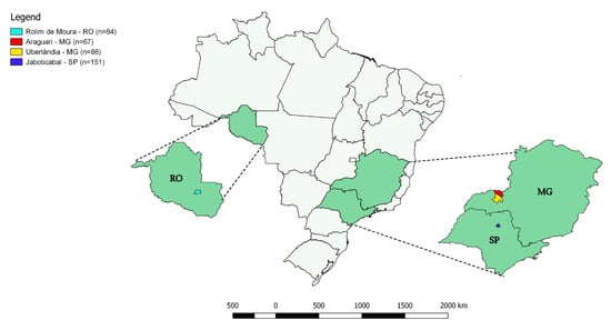 Between the months of August and September 2018, 390 blood samples were collected from domiciled cats in Minas Gerais (155 samples—Uberlândia 19°00′39” S 48°05′45″ W and Araguari 18°24′43” S 49°03′09″ W), São Paulo (151 samples—Jaboticabal 21°15′33″ S 48°18′54″ W) and Rondônia (84 samples—Rolim de Moura 11°43′21.8″ S 61°46′29.5″ W) states (Figure 4). These samples were collected with the consent of the animals’ tutors during neutering campaigns promoted by the Animal Protector Association Neutering Center, located at the School of Agricultural and Veterinarian Sciences (FCAV/ UNESP, Jaboticabal, São Paulo State, Southeastern Brazil), Animal Populational Control Project a partnership by the Federal University of Uberlândia (UFU) and the city’s Zoonosis Control Center (Uberlândia, Minas Gerais State) [32] and by researchers of Universidade Federal de Rondônia. All procedures were authorized and approved by the Animal Use Ethics Committee of the Universidade Estadual Paulista (IACUC FCAV/UNESP 012017/17). Blood samples were collected in tubes containing EDTA, transported in liquid nitrogen to the laboratory, and stored in a freezer (−80 °C) until sample processing.