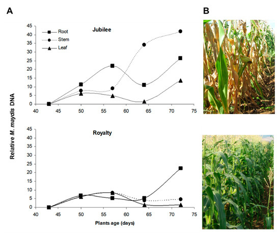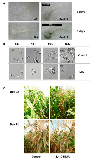 - Degani, O.; Drori, R.; Goldblat, Y. Plant growth hormones suppress the development of Harpophora maydis, the cause of late wilt in maize. Physiol. Mol. Biol. Plants 2015, 21, 137–149. [Google Scholar] [CrossRef][Green Version]