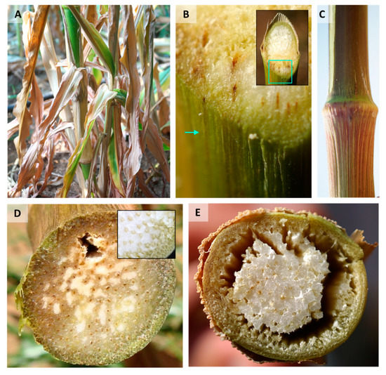 - Abd El-Rahim, M.F.; Fahmy, G.M.; Fahmy, Z.M. Alterations in transpiration and stem vascular tissues of two maize cultivars under conditions of water stress and late wilt disease. Plant Pathol. 1998, 47, 216–223. [Google Scholar] [CrossRef]