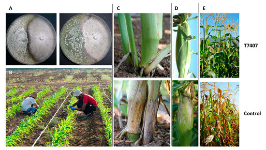 - Degani, O.; Dor, S. Trichoderma Biological Control to Protect Sensitive Maize Hybrids Against Late Wilt Disease in the Field. J. Fungi 2021, 7, 315. [Google Scholar] [CrossRef]