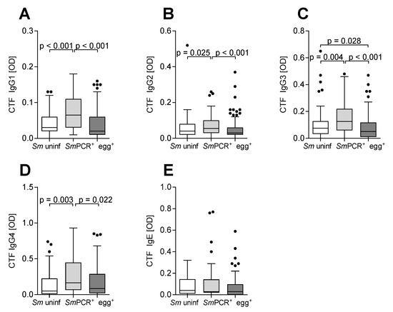 Higher levels of SmCTF-specific IgGs in SmPCR+ individuals. Serum samples from all study participants (Sm uninfected n = 60, SmPCR+ n = 62, egg+ n = 108) were analysed for levels of SmCTF-specific antibodies using ELISA technology. The graphs show the optical density of CTF-specific IgG1 (A), IgG2 (B), IgG3 (C), IgG4 (D) and IgE (E). Data are shown as box whiskers with median, interquartile ranges and outliers. Since data were non-parametric, statistical significances between the indicated groups were obtained after Kruskal–Wallis and Mann–Whitney U-tests.