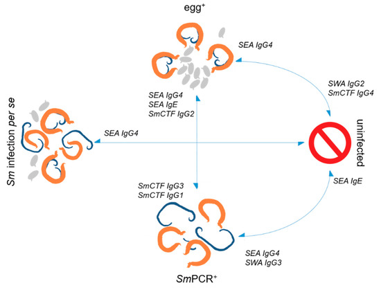 Although there is a general paucity of clinical studies investigating the relationship between specific antibody production and its impact on the severity of the infection, some studies have detected increased levels of SEA-specific IgG4 in patients with severe pathology [31,32]. Even though our participants were not examined clinically, and therefore we cannot draw any conclusions about symptomatic responses, the data obtained from the combined regression analysis on the same cohort indicate that the measurement of SEA IgG4 levels might be an interesting tool in order to identify egg− but infected individuals. Moreover, future studies might apply our combined panel of stage-specific Ig measurements to correlate it to different pathologic stages or to create a lateral flow test with all three antigens for an easy/non-invasive application in the field. The lack of consecutive stool sampling might be initially seen as a limitation of the study; on the other hand, it propagated this entire research project since, upon initial analysis of some parameters, we noted that the non-infected cohort had two distinct groups. However, future studies should therefore focus on molecular techniques that are field-applicable, such as LAMP assays, to detect schistosome infection in egg-free individuals.